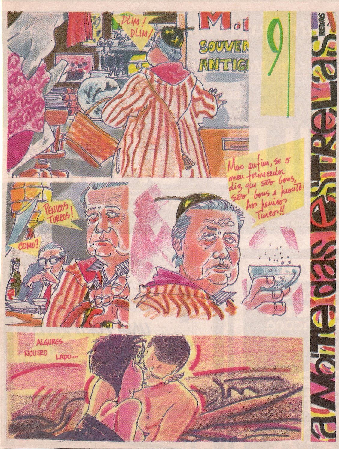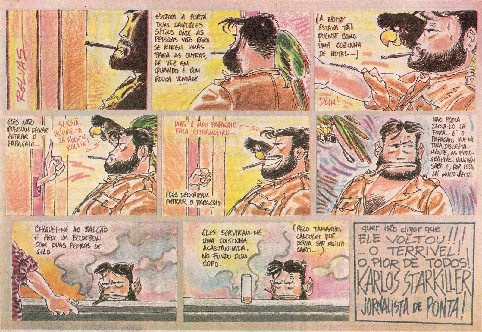 Com Sangue Violeta, história nada linear de uma jovem desajustada e anti-social transformada em estreIa rock, Fernando Relvas regressa à temática humorística em que se iniciou, adaptando o seu estilo ao novo tipo de histórias, tornando-o mais caricatural. Exemplo típico da forma como Relvas por vezes se dispersa, a intriga principal é cortada por flash backs perfeitamente surrealistas e por uma versão western da história do capuchinho vermelho. É também aqui que vai aparecer pela primeira vez Karlos Starkiller, jornalista de ponta, o único personagem constante ao longo de toda a sua obra. Starkiller ganhará o estatuto de protagonista em A Sombra de Xizhakt Rabin uma complexa história de espionagem internacional passada no Líbano, vagamente inspirada no caso Irangate, que evoluirá para uma comédia delirante, onde aparece um Mário Soares com cabeça de abóbora, alguns colegas de Relvas no jornal Se7e e até o verdadeiro super-herói do Terceiro Mundo, o Capitão Latino-América. A forma como a história reflecte a actualidade está bem patente na interrupção da intriga durante uma semana, para dar lugar a uma entrevista com o Presidente americano Ronald Reagan, de visita a Portugal em Maio de 1985. Uma tomada de posição que, segundo o que Relvas me disse, se deveu às pressões da sua namorada da altura, uma rapariga politicamente muito empenhada...