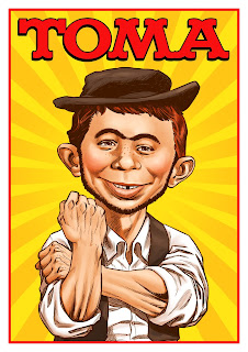 O mesmo podemos dizer em relação às personagens da televisão, pois o “nosso” Zé Gato (o primeiro detective da TV portuguesa) surge ao lado de Jessica Rabitt, numa ilustração de Pep Del Rei, enquanto Marta Teives coloca o Scooby Doo e os seus amigos, a fugirem de um Olharapo. Abordagem diferente é a seguida por Nuno Duarte (que assina “o outro Nuno” para não ser confundido com o argumentista seu homónimo) que recria duas imagens icónicas, introduzindo-lhes elementos tipicamente portugueses. Assim, na capa da revista Mad, que se transforma em Toma!, em vez Alfred E. Neuman - a mascote da revista, cuja cara está sempre em destaque nas capas, substituindo a personalidade, ou personagem, que é alvo de paródia - temos o “nosso” Zé Povinho, a fazer o típico “manguito”. O mesmo sucede na outra imagem que criou para esta exposição, que parte do célebre cartaz do Buffalo Bill’s Wild West Circus, substituindo o mais famoso dos cowboys, por um campino chamado JoaQuim Touro, enquanto que o Circo do Velho Oeste dá lugar ao Grupo de Forcados Amadores.