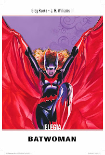 O trabalho de escrever a primeira história a solo desta nova heroína - Elegia, o volume que têm entre mãos - recaiu sobre o argumentista Greg Rucka, conhecido no meio pelas suas personagens femininas fortes e independentes. Rucka é um escritor de romances policiais aclamados, que irrompeu na cena dos comics no final dos anos 1990 com uma mini-série intitulada Whiteout (entretanto adaptada ao cinema, com Kate Beckinsale no papel principal), a que se seguiu a sua série mais longa até à data, Queen & Country. Em ambos os casos, tratam-se de histórias policiais ou de espionagem, em que as personagens principais são femininas e granjearam enorme popularidade junto dos leitores. Rucka começou entretanto a trabalhar para a DC, nos anos 2000, e já escreveu argumentos para inúmeras personagens, entre as quais destacamos as histórias que assinou para a Mulher Maravilha, e a série Gotham Central, que escreveu a meias com Ed Brubaker. O relançamento de Batwoman permitiu-lhe aliás recuperar personagens desse comic. Gotham Central acompanhava as aventuras e casos duma série de polícias e detectives de Gotham, focando a acção numa esquadra da polícia e não no Batman, e uma das personagens principais da série, a detective Renée Montoya, reaparece em na série da nova Batwoman como namorada da super-heroína. Tal como a primeira Batwoman, esta também é uma rica herdeira chamada Kate Kane. Ao contrário da primeira Batwoman, Kate é de origem judaica, a sua aparência é a duma jovem gótica e algo anarquista, é lésbica, e o seu pai é um ex-militar e operacional de forças especiais, que treinou a filha para combater o crime.