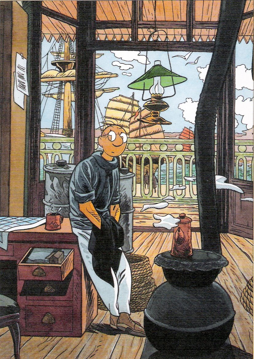 Depois de arriscar a vida nas mais remotas paragens, conhecendo personagens fascinantes, capazes dos mais heróicos actos e das mais baixas traições, muitas vezes em simultâneo — como Georges Town, o sanguinário pirata de “Le Mangeur D’Archipels”, que faz de Theodore o seu biografo oficial, procurando no registo e publicação das suas memórias a explicação e o branqueamento de uma vida de crimes —, só ao regressar a casa Theodore Poussin encontrará aquilo que procurou. Tal como em “Le Trésor de Rackam Le Rouge”, de Hergé, o tesouro que Tintin e Haddock procuraram numa ilha distante estava à sua espera em Moulinsart, também Theodore vai finalmente encontrar o Capitão Steene em Dunquerque, numa casa perto das dunas onde brincava em criança; Capitão Steene que, na realidade, é o verdadeiro pai do herói, que, tal como o Monge, da “Balada do Mar Salgado”, se dedicara à pirataria em paragens distantes como forma de expiar um amor trágico e contrariado.
