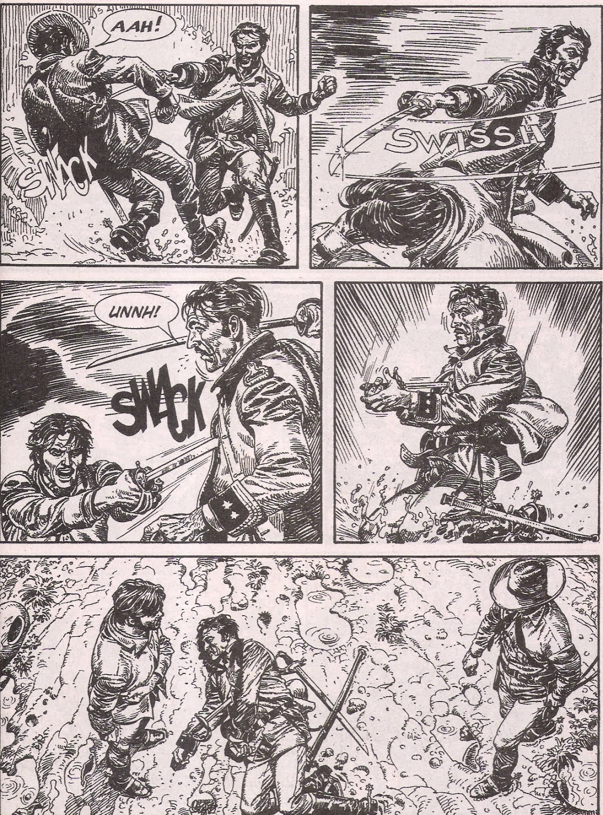 Quem costuma acompanhar este blog sabe bem que a minha ligação à série Tex fez-se muito mais pelos desenhadores que a ilustram do que pelo carisma da personagem, daí que siga com especial atenção os Texones, que já me fizeram descobrir desenhadores do calibre de um Pasquale Frisenda, ou de um Carlos Gomez. No caso de Civitelli, cujo trabalho conhecia das revistas mensais, devo confessar que, embora reconheça a qualidade e a extraordinária minúcia do seu traço clássico, está longe de ser dos meus desenhadores do Tex preferidos, muito por força do tratamento fisionómico muito suave e quase idealizado que dá às personagens principais, longe dos rostos marcados e “vividos”, habituais nos desenhos de José Ortiz, Guido Buzzelli, Victor De La Fuente ou Carlos Gomez, que claramente prefiro.