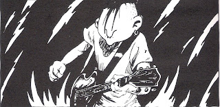 Regressado a Portugal depois destas férias inesquecíveis, o Menino Triste deparou-se com a realidade bem diferente do Portugal pós-25 de Abril. Mas, apesar em vez de cristas e pulseiras de picos, haver cabelos compridos e barba, a música também era importante. Não por acaso, numa das últimas imagens do livro vemos o Menino Triste defronte de uma parede onde estão um grafitti do Zeca Afonso e um cartaz do FMI, do José Mário Branco. Uma boa maneira de Mascarenhas nos lembrar que, também neste país de brandos costumes, a cantiga é uma arma.
